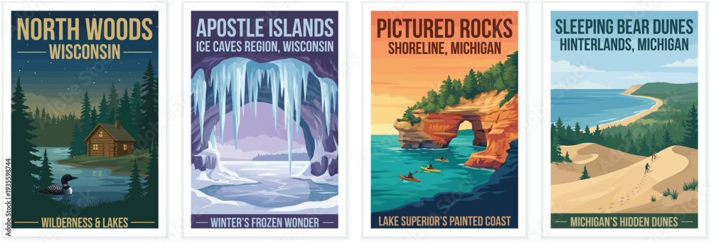 Vintage usa travel poster set. Including north woods wisconsin, apostle islands ice caves, pictured rocks, and sleeping bear dunes. Retro vector illustration. #1935598744