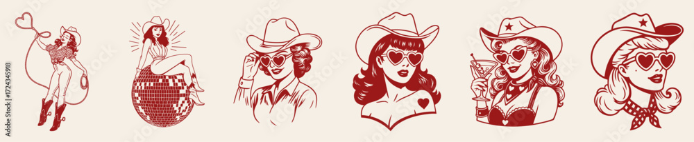 Vintage western cowgirl pinup set, stylish American retro women portraits from 50s 60s and 70s fashion era #1724345918