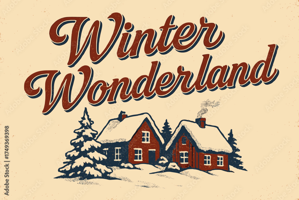 Vintage Winter Scene. Winter Wonderland. vintage serif script, shadowed outlines, aged print texture, #1749369398