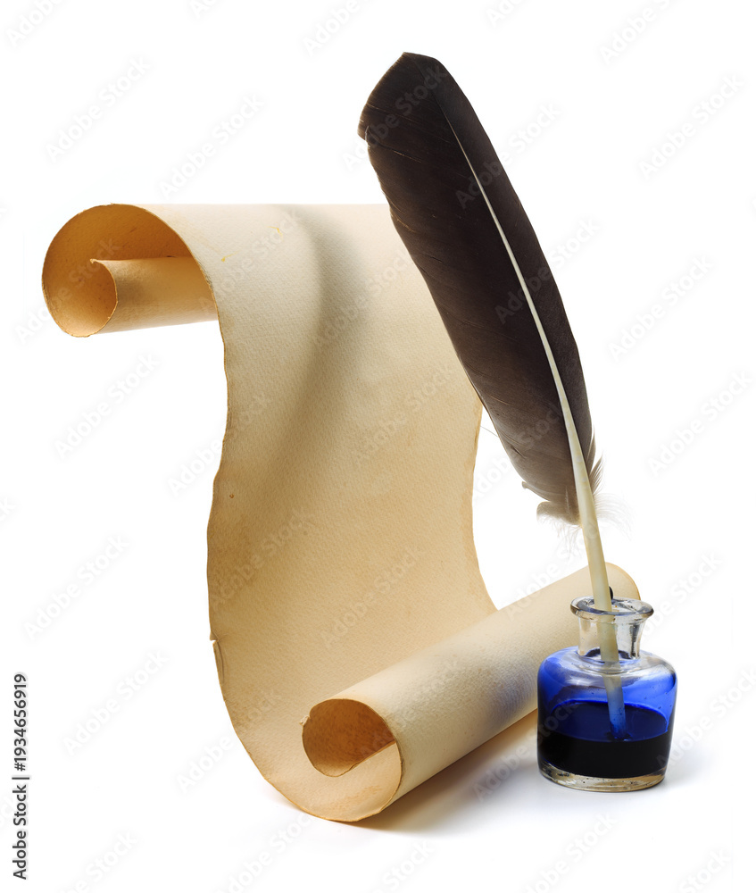 Vintage writing set with a feather quill pen, blue inkwell, and a blank parchment scroll. Isolated on a clean white background with copy space. #1934656919