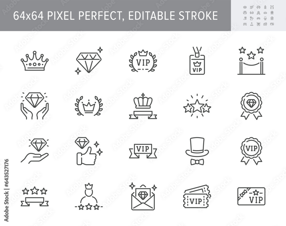 VIP line icons. Vector illustration include icon - benefit, ribbon, diamond, quality, crown, laurel, victory, star outline pictogram for privilege person program. 64x64 Pixel Perfect, Editable Stroke #643527176