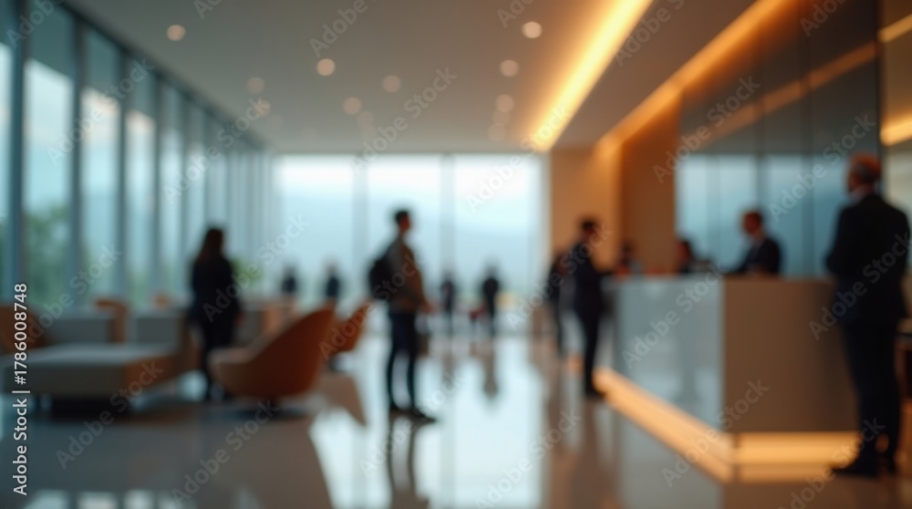 Vista borrosa del interior de un banco moderno con mostradores de cajeros, clientes esperando y una suave iluminación ambiental que se refleja en el cristal #1786008748