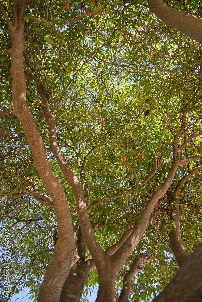 Vista contrapicada de la copa de un árbol Maitén con frutos pequeños #1950421475