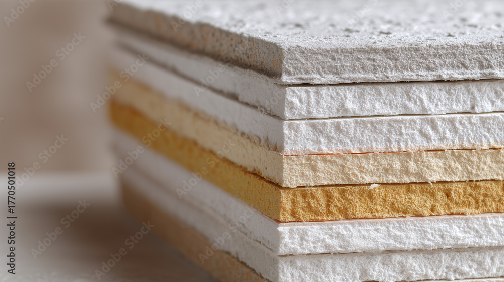 Vista de paneles aislantes en capas de tonos blanco, amarillo y beige, con texturas fibrosas y espumosas. Perfecto para construcción, eficiencia térmica, acústica y diseño técnico. Aislamiento acústic #1770501018
