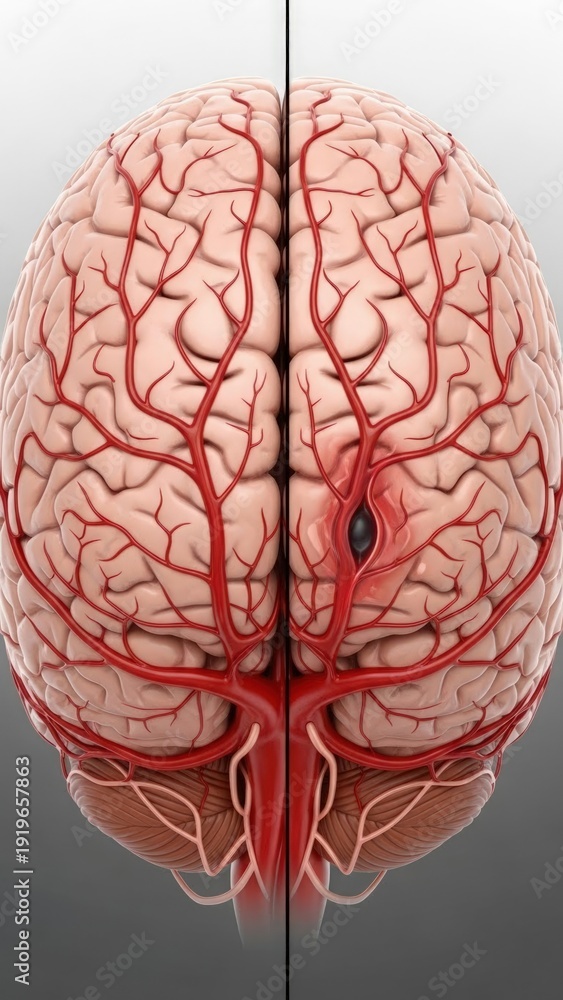 Visual comparison of healthy human brain anatomy and diseased state featuring a hemorrhagic stroke, an intracerebral hemorrhage, or subarachnoid bleeding from an aneurysm. #1919657863