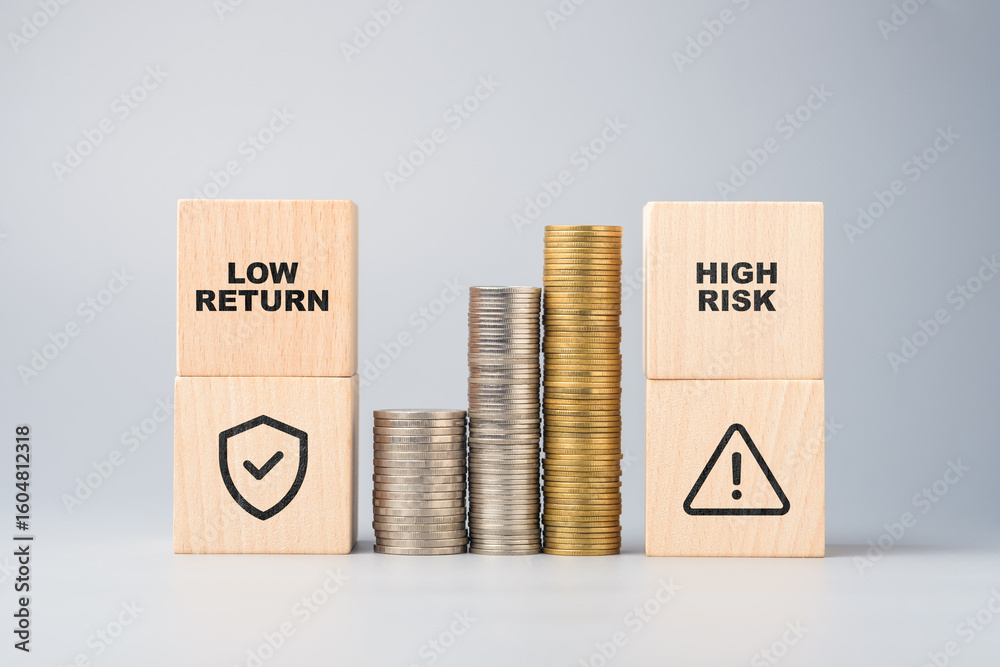 Visual comparison of low return and high risk financial strategies using wooden blocks and stacked coins, symbolizing safety versus potential reward #1604812318