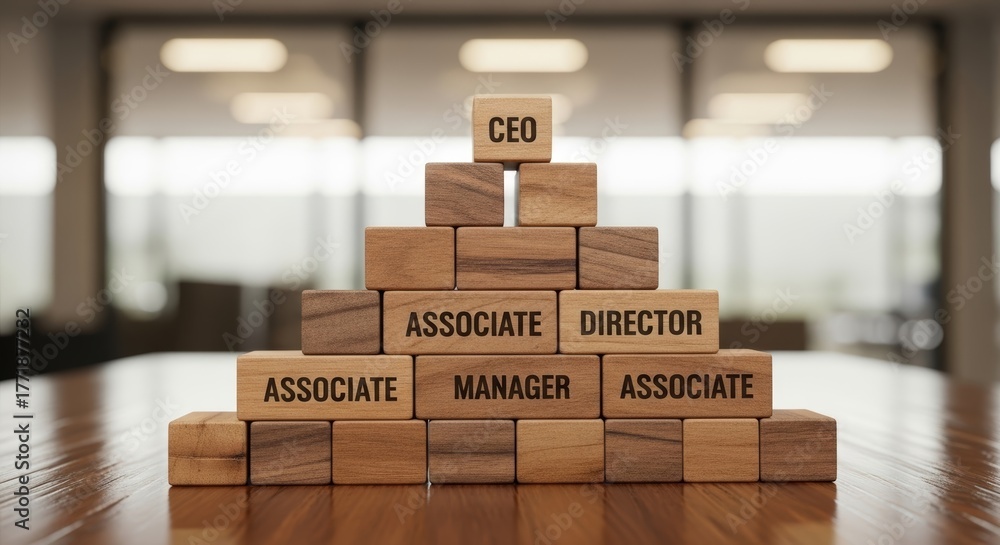 Visualize corporate hierarchy and career progression with wooden blocks illustrating management titles from CEO to Associate #1771877232