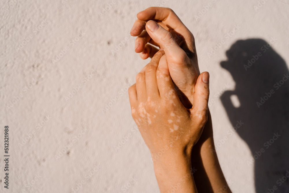 Vitiligo skin pigmentation on the hands of woman. Skin seasonal diseases. #512321988