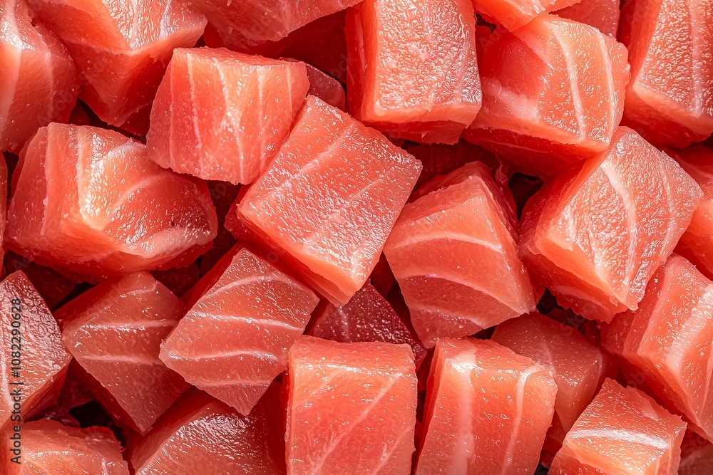 Vivid Close-Up of Sushi-Grade Tuna Cubes, Emphasizing Freshness and Precise Dicing Techniques. Ideal for Food Styling, Culinary Editorials, or Seafood Product Promotions. #1082290628