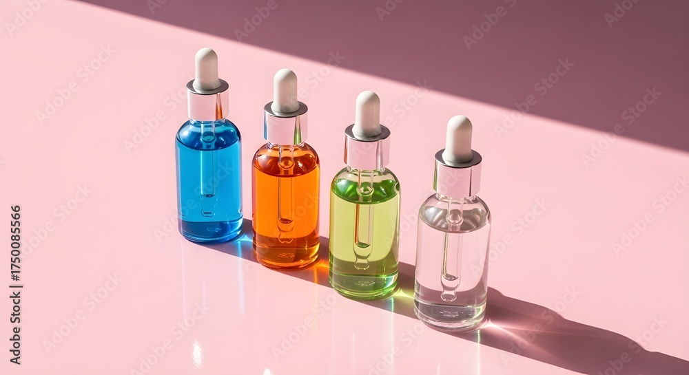Vivid cosmetic serum bottles displayed on a soft pink background, highlighting beauty, freshness, and modern skincare elegance. #1750085566
