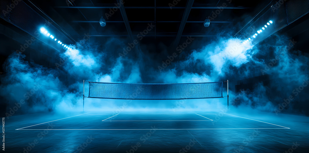 Volleyball Court in the Blue Atmosphere: A dramatic shot of an empty volleyball court bathed in blue light and atmospheric fog, spotlighting the net and court markings. #1371443775