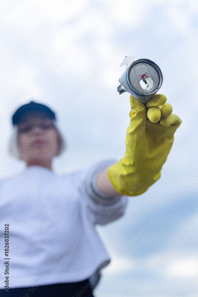 volunteer showing a collected metal can during beach cleanup, highlighting pollution, ecology, environment protection, sustainability and coastal awareness. #1826837202