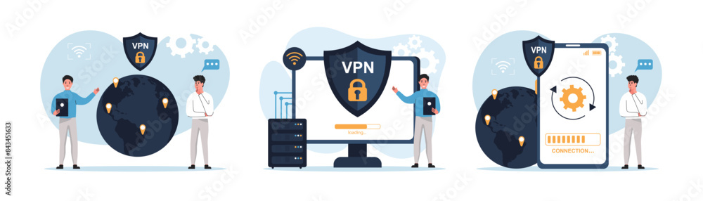Vpn technology system. Characters connect to secure VPN points. VPN connection concept. Internet connection flat illustration vector. #843451633
