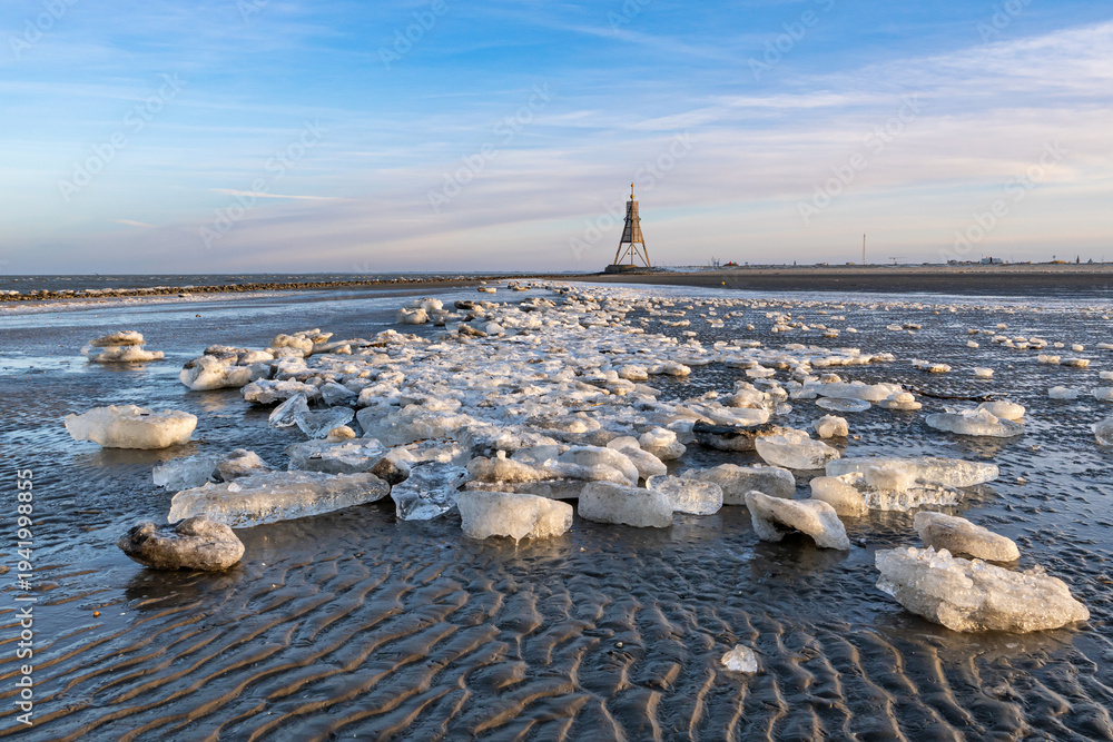 Wadden Sea in Cuxhaven, Germany on a frosty winter day with the Kugelbake, a historic aid to navigation at the northernmost point of Lower Saxony, in the background #1941998855