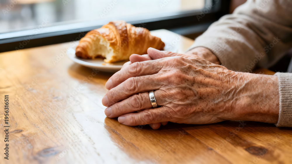 Waiting with Anticipation: Captured here, a still life evokes quiet reflection; weathered hands rest gently on a warm wooden table next to a half-eaten golden croissant, ready to be enjoyed. #1956316511