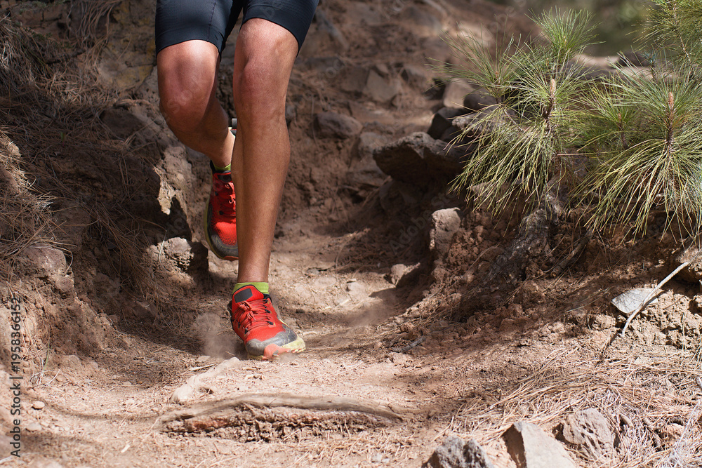 Walking or running exercise legs on rocky footpath in bright forest achievement fitness adventure and exercising in spring or summer nature motivation and inspirational activity #1958366152