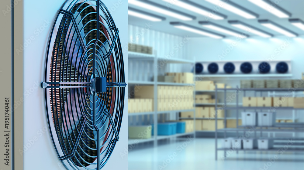 Warehouse climate control, ventilation maintenance. Industrial cooling fan mounted on wall operates in storage facility with shelves and boxes, supporting air circulation and temperature regulation. #1951740461