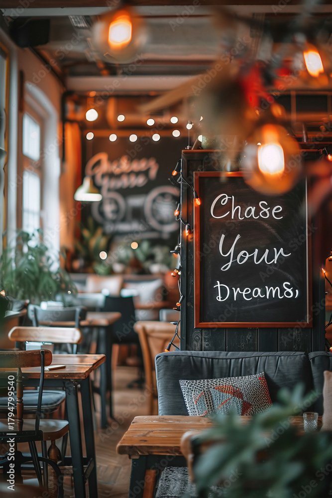Warm and cozy cafe with chase your dreams chalkboard #1794799540