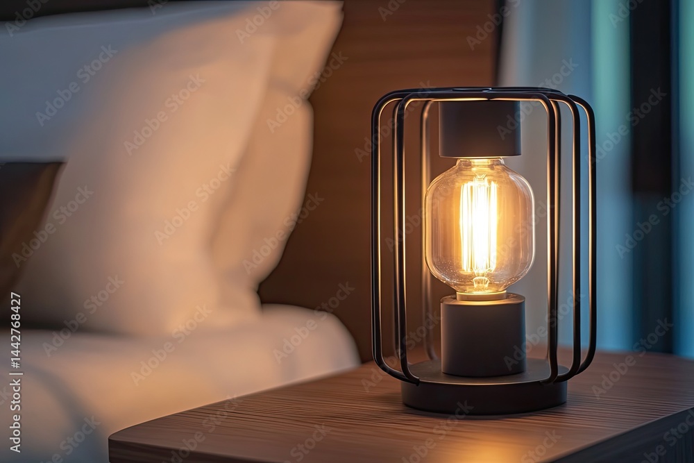 Warm bedside lamp illuminates a bedroom Soft, warm light from a vintage-style Edison bulb, enclosed in a dark gray metal cage, sits on a light brown wooden nightstand #1442768427
