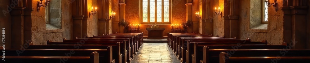 Warm candlelight illuminates a serene church interior, casting soft shadows on aged stone walls and pews The peaceful ambiance evokes spirituality and tranquility , ambiance, devotion, religious #1773941196