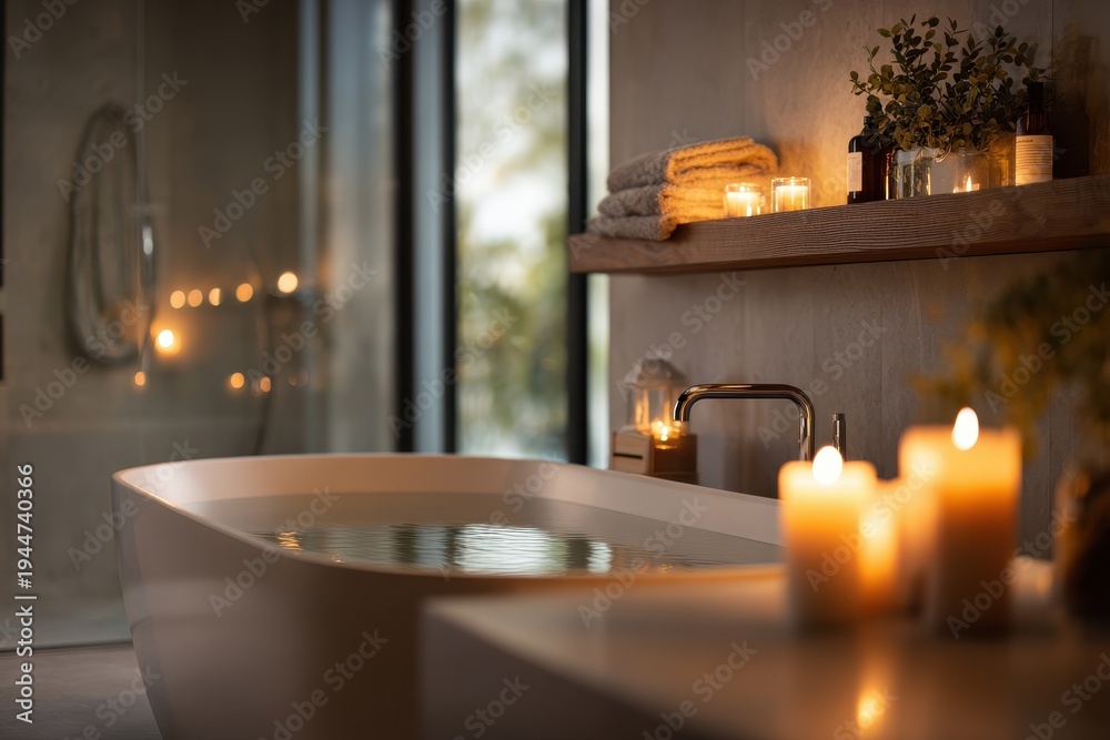 Warm candlelit modern bathroom with a freestanding tub at dusk #1944740366