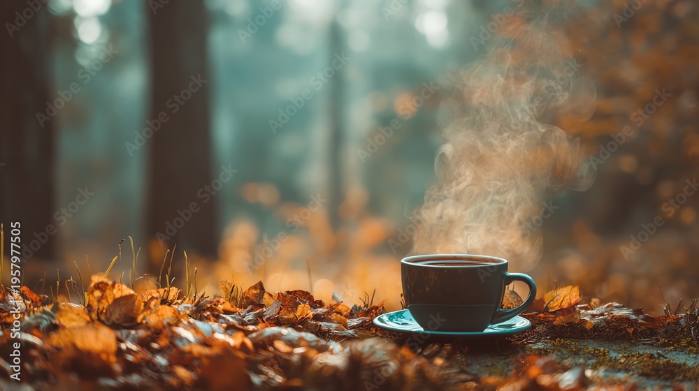 Warm cup of coffee in autumn forest scenery. #1957977505