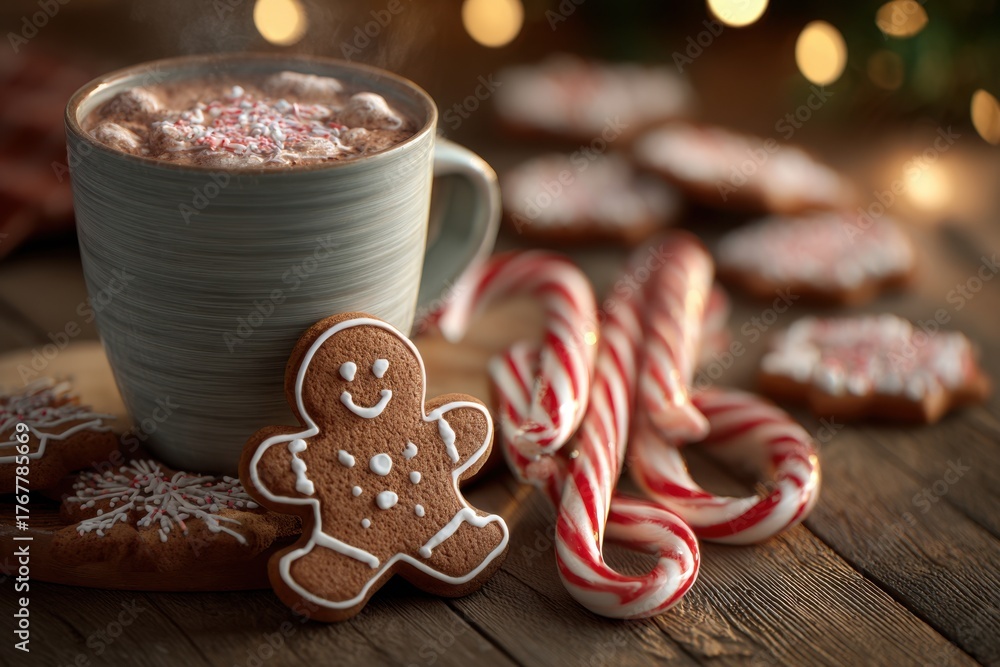 Warm cup of hot chocolate topped with whipped cream and sprinkles, accompanied by gingerbread cookie and candy canes, creating a cozy festive atmosphere for winter celebrations #1767785669