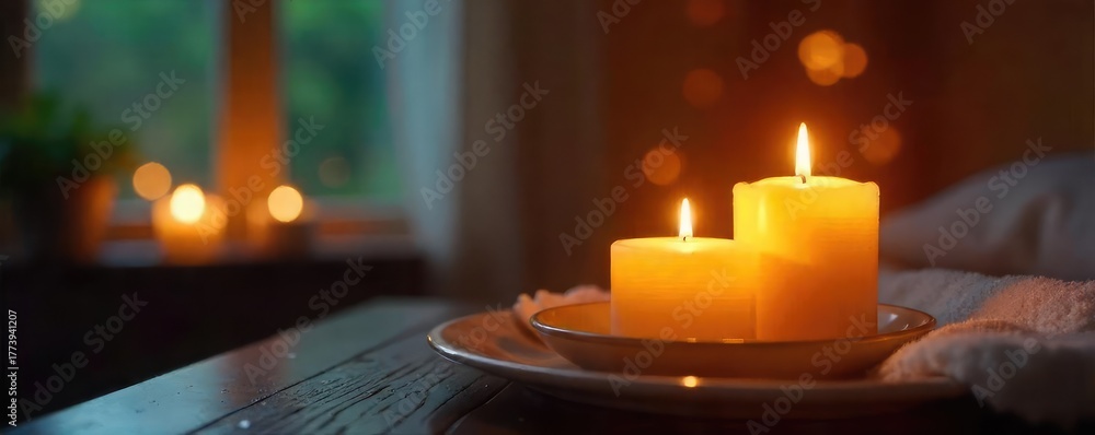 Warm, glowing candlelight illuminates a softly-lit scene, creating a cozy and romantic ambiance Perfect for home decor, relaxation, and spa themes , soft light, still life, beauty #1773941207