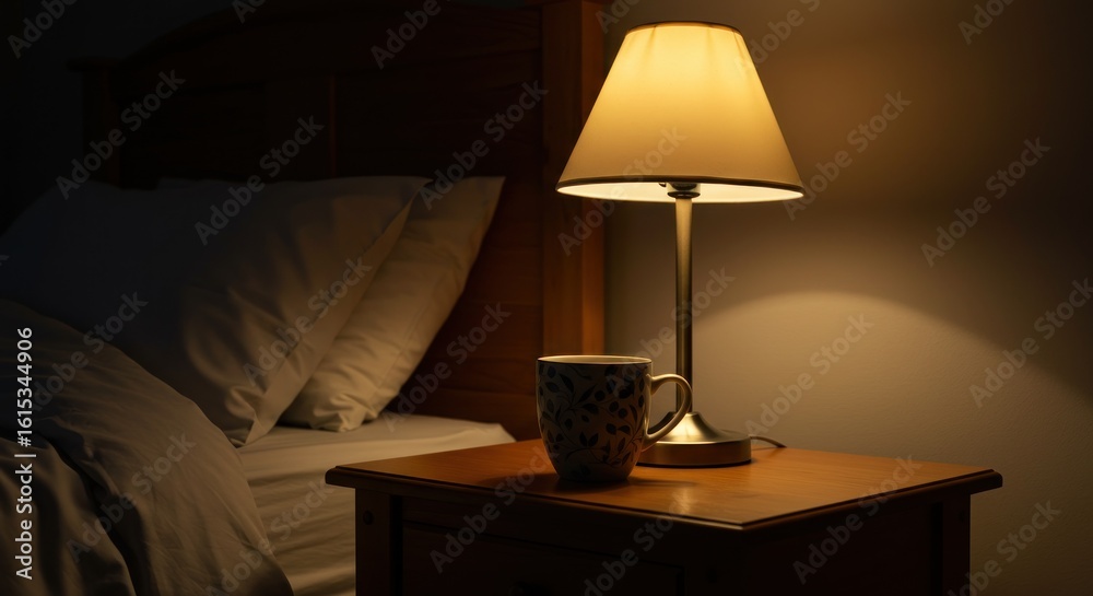 Warm nightstand lamp illuminates mug beside bed, beckoning restful sleep #1615344906
