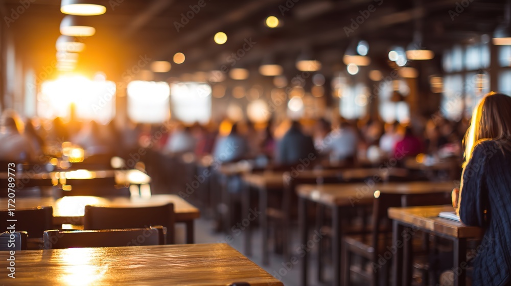 Warm Sunset Glow Inside Bustling Modern Restaurant Dining Space #1720789773