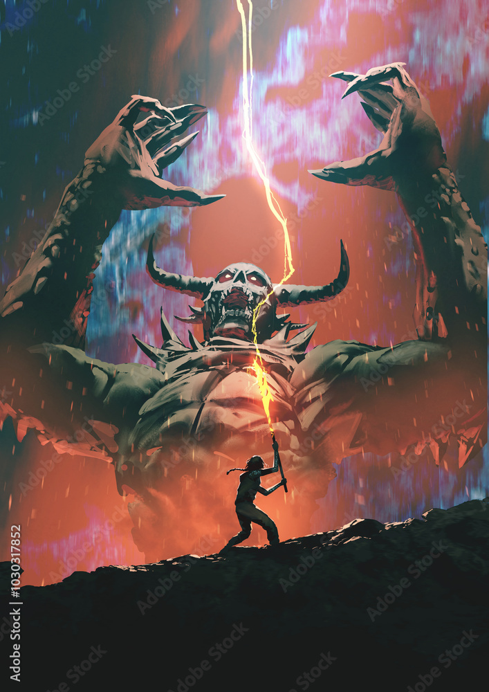 Warrior Facing Giant Demon in Epic Fantasy Battle #1030317852