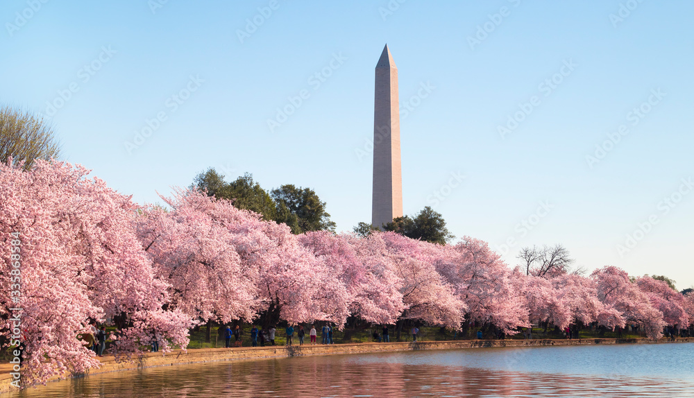 Washington DC – April 4, 2019: Cherry blossom festival with Washington memorial around the tidal basin #335868584