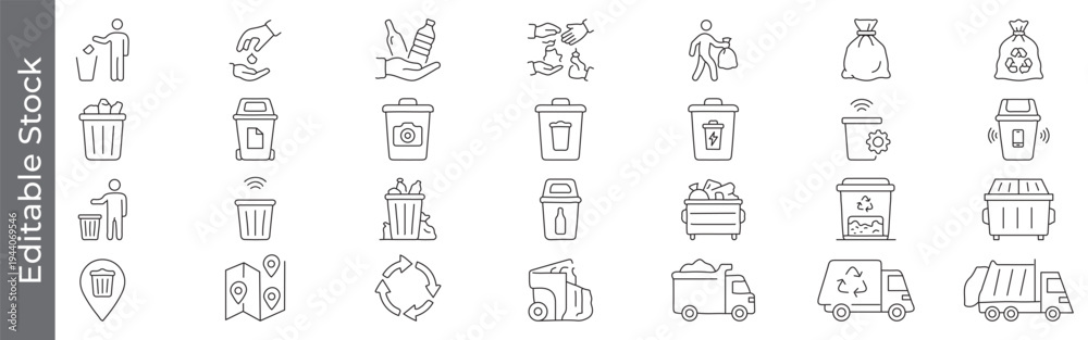 Waste management and recycling icon set – editable outline symbols of trash, bin, recycling, garbage carry, garbage truck, sorting and eco-friendly #1944069546