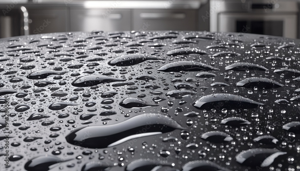 Water droplets on sleek black countertop in modern kitchen. #1918286557