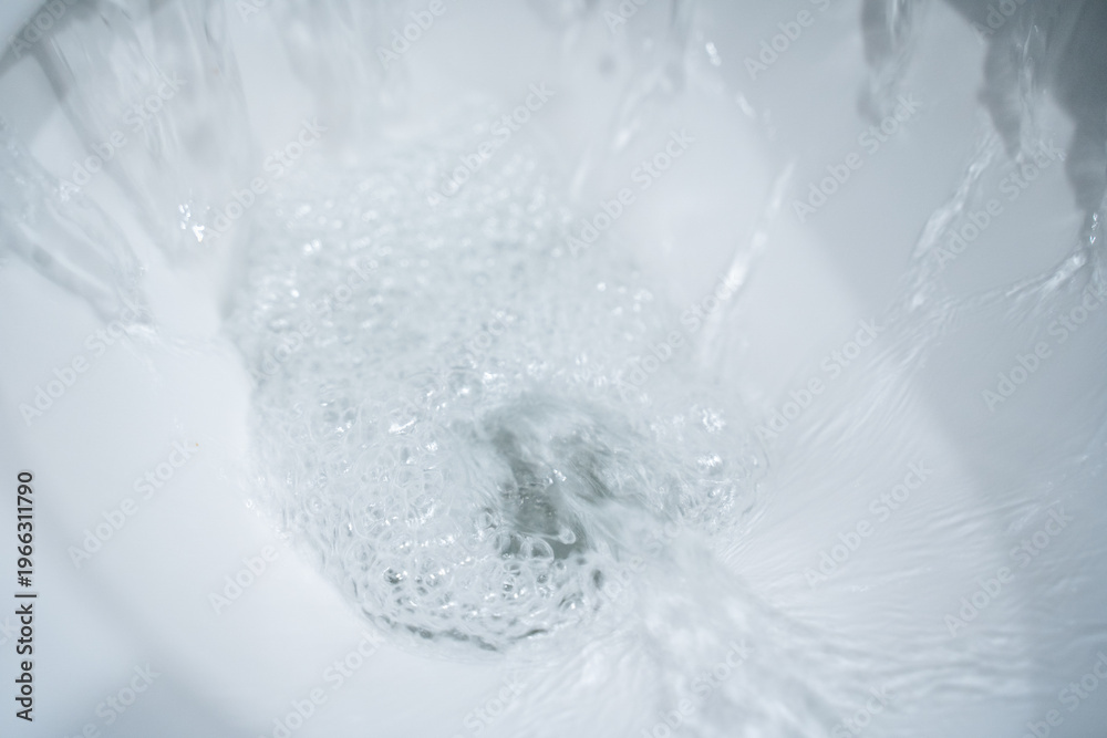 Water swirling in a white ceramic toilet bowl during a flush, foamy bubbles and motion blur forming a vortex around the drain, clean bathroom close up with bright highlights and minimal white interior #1966311790