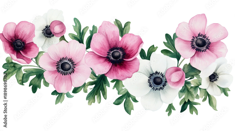 Watercolor anemone flowers in pink and white with green leaves, arranged as a decorative floral set on transparent background. #1898698782