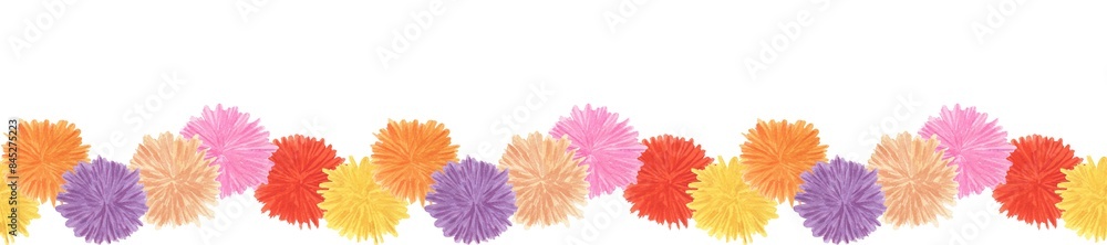 Watercolor banner with colorful pom poms. Seamless pattern with trends colors: pink, beige, red and purple. Holidays and party theme. Hand drawn illustration isolated on transparent. #845275223