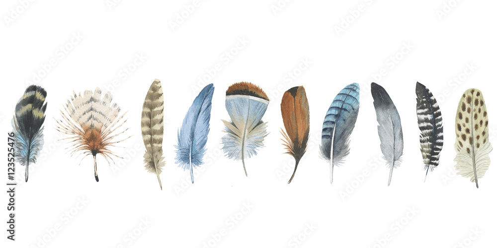 Watercolor bird feather from wing isolated. Aquarelle feather for background, texture, wrapper pattern, frame or border. #123525476