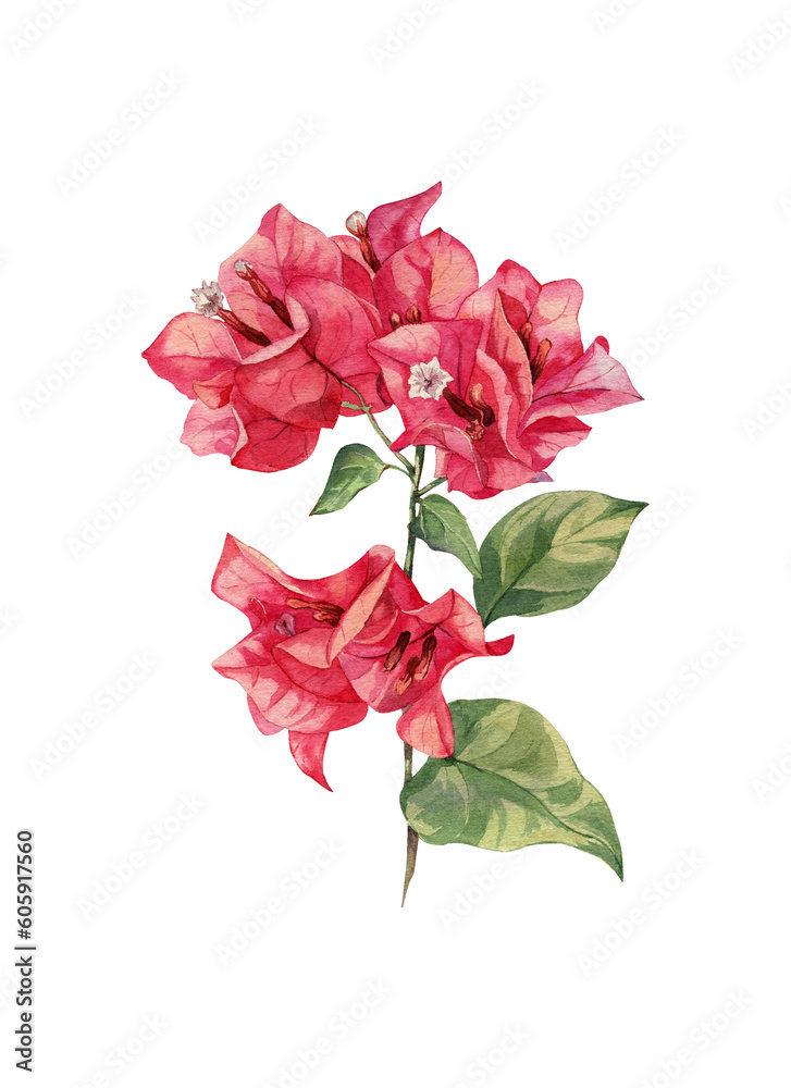 Watercolor bougainvillea. Pink tropical flower. Hand drawn illustration transparent on white. #605917560