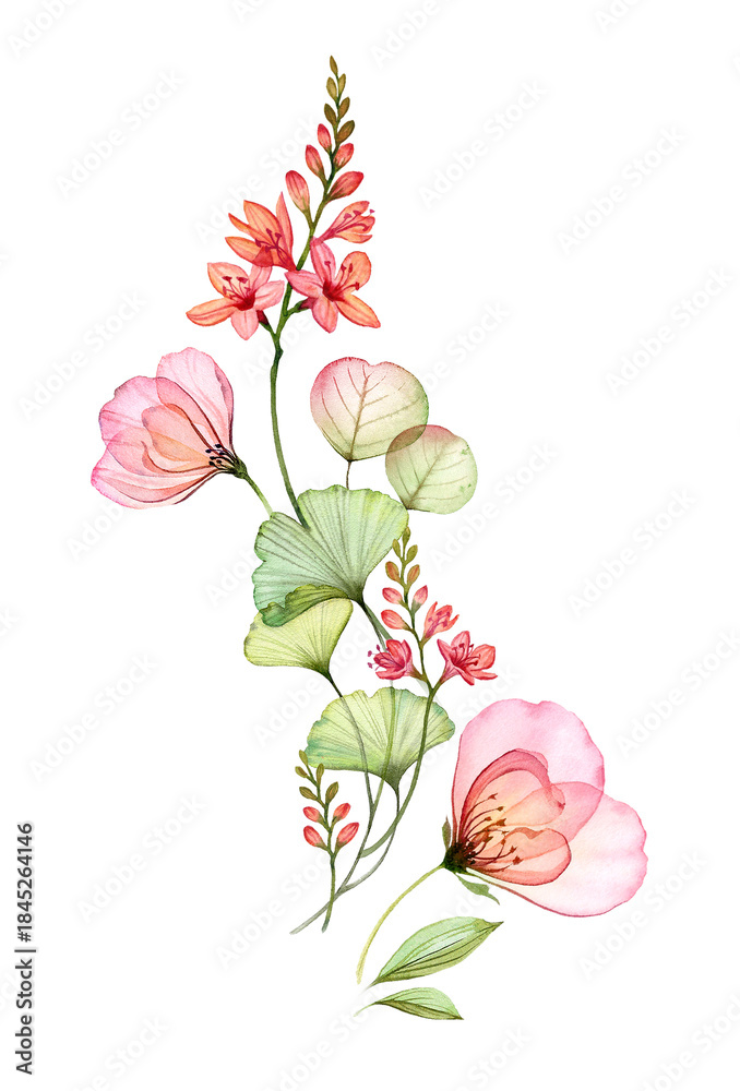 Watercolor floral arrangement. Vertical design element. Abstract exotic fresia flowers isolated on white. Botanical illustration for cards, wedding design, cosmetics #1845264146