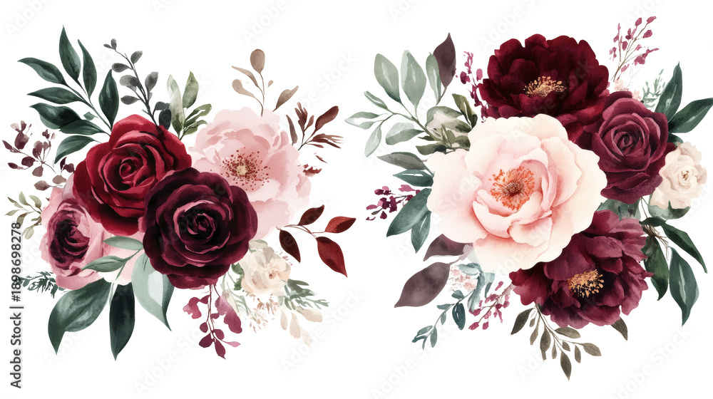 Watercolor floral bouquet set with burgundy and blush roses, peonies, and greenery, isolated on black background; elegant romantic botanical clipart for wedding and invitation design. #1898698278