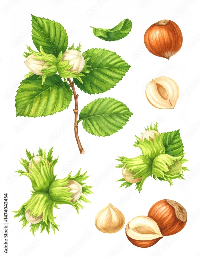 Watercolor hazelnuts set showing nuts, leaves and branch #1474042434
