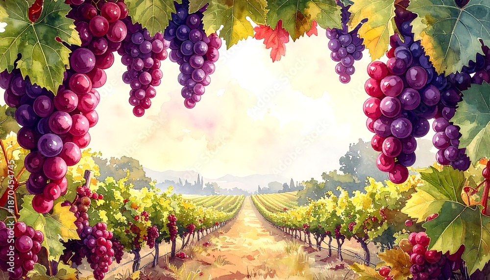 Watercolor illustration of a vineyard with ripe grapes, lush vines, and a sunny landscape. The grapes hang down framing the view #1870454745