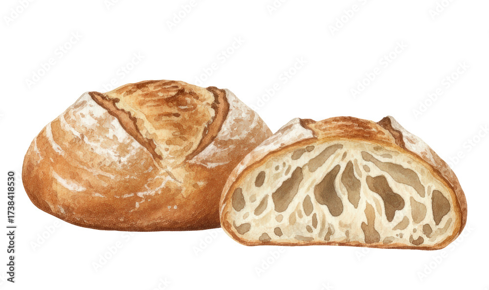 Watercolor Illustration of Artisan Rustic Bread Loaf with Cross Section #1738418530