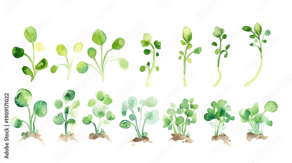 Watercolor illustration of five young plant seedlings with delicate roots and green leaves on white background #1909171022