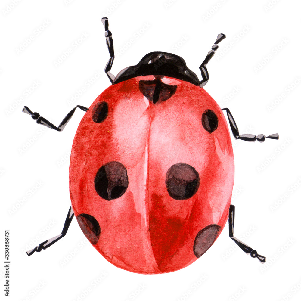 Watercolor illustration of ladybug in red ink with black spots #330868731