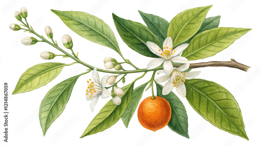 Watercolor Orange Blossom Branch with Fruit, Isolated on Transparent Background, Botanical Illustration, Floral Design, Orange Blossom, Botanical Painting, Citrus Fruit #1214867059