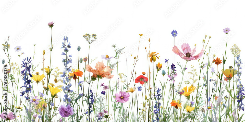 Watercolor painting depicting a colorful field of wildflowers in bloom on a sunny day #767380176