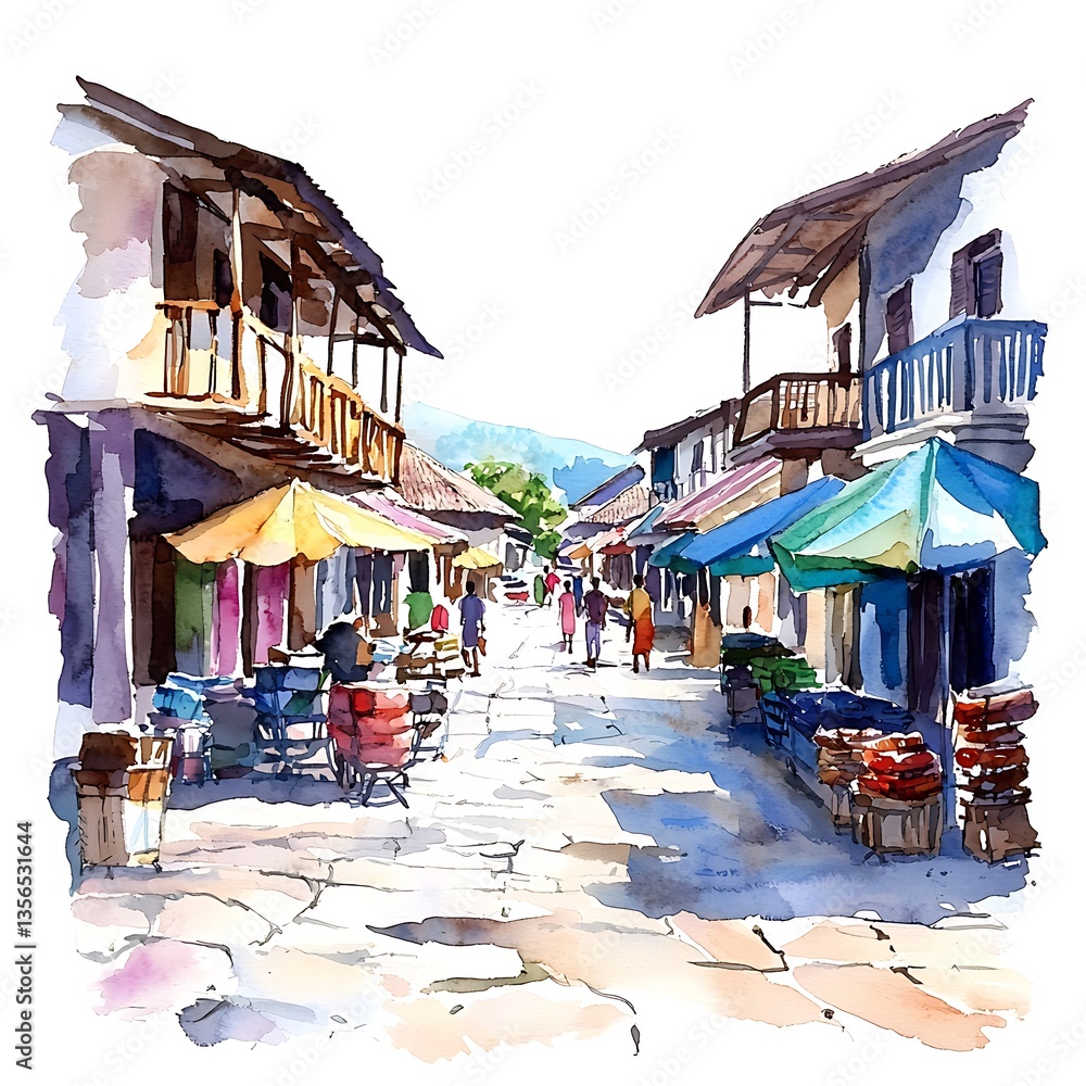 Watercolor Painting of a Charming Street Scene in a Mountain Village. This picturesque illustration depicts a sunlit cobblestone street lined with traditional buildings and market umbrellas. #1356531644