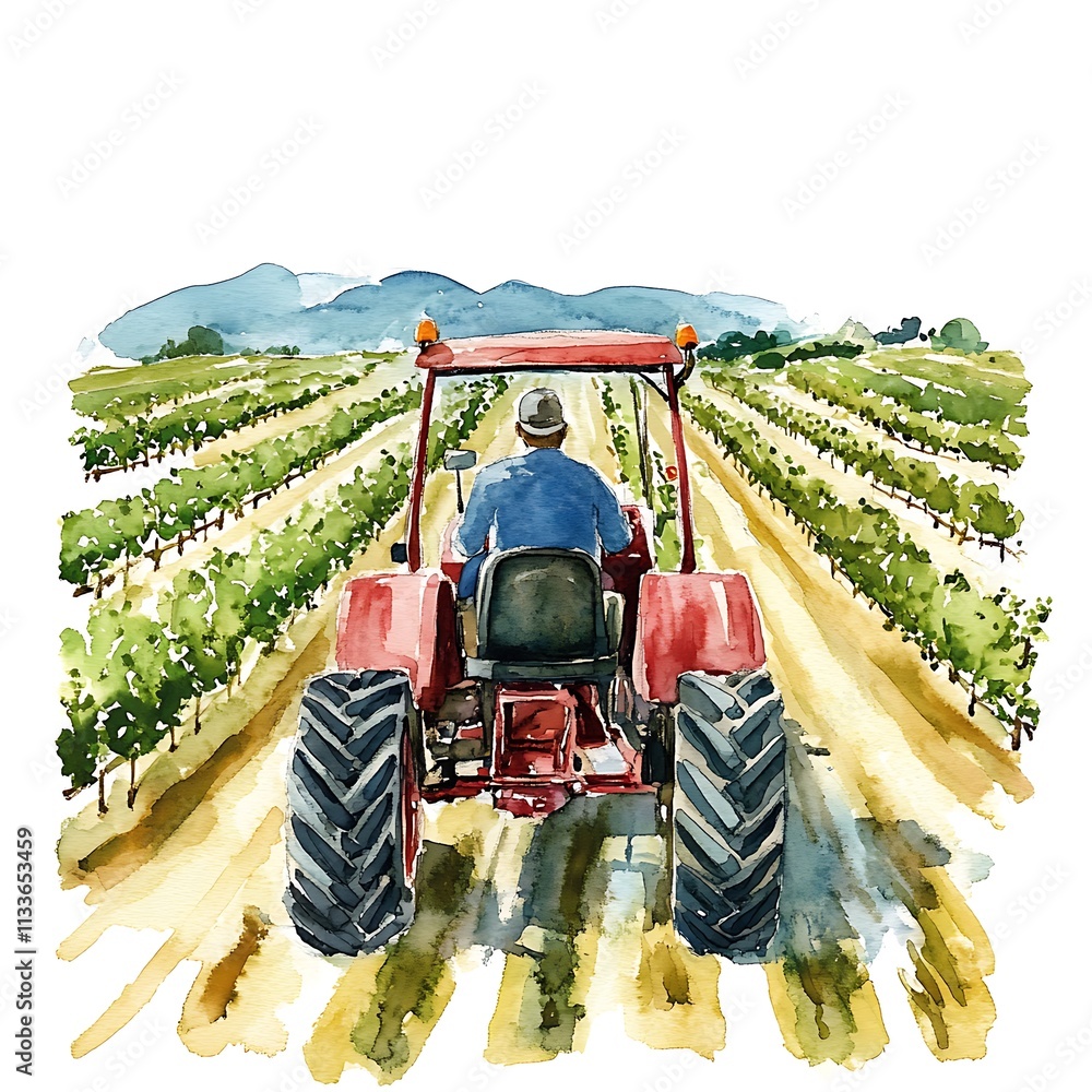 Watercolor painting of a farmer driving a red tractor through a vineyard. #1133653459